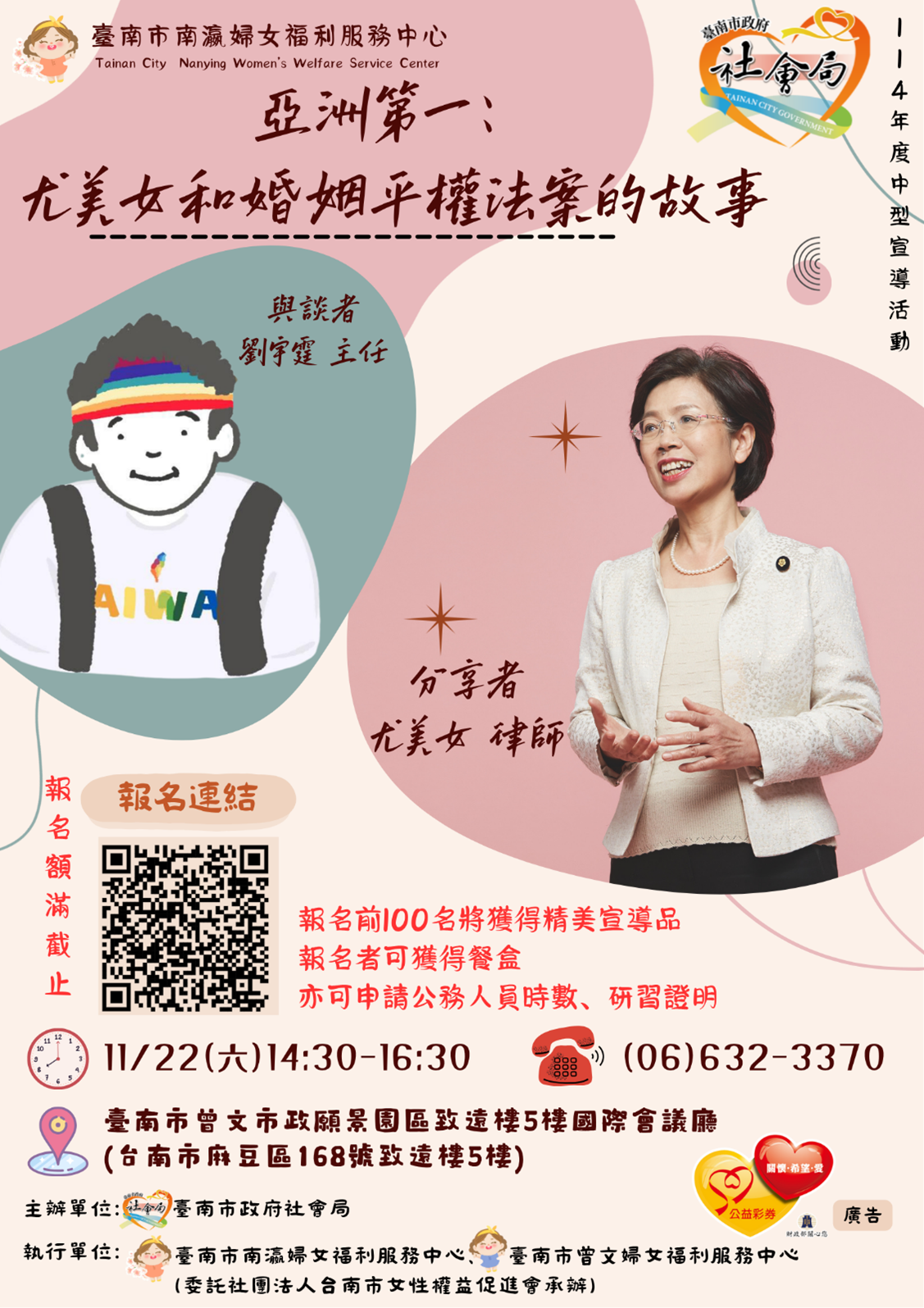 To promote gender equality and women's public participation, the Tainan City Government Social Affairs Bureau is holding the 2025 Women's Power Celebrity Lecture Series. Attorney Yu Mei-mei, a champion of marriage equality, will share her experience in the legislative process and its social impact. Through dialogue and exchange, the lecture aims to deepen public understanding and awareness of gender issues. All are welcome to register.