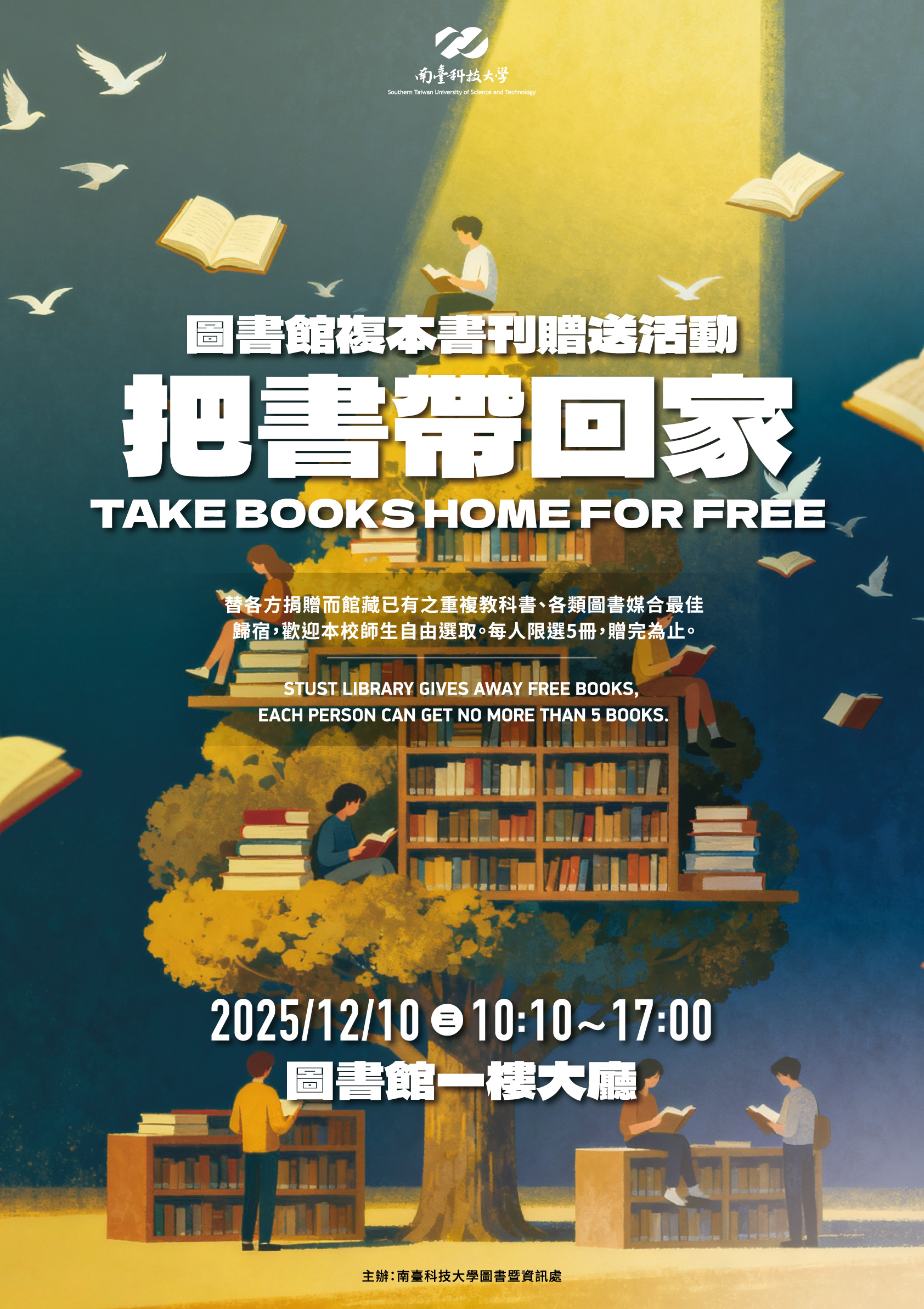 STUST library gives away free books, each person can get no more than 5 books. Date: December 10, 2025 (Wednesday) Time: 10:10 AM – 5:00 PM Lobby: 1st Floor, Library, STUST
