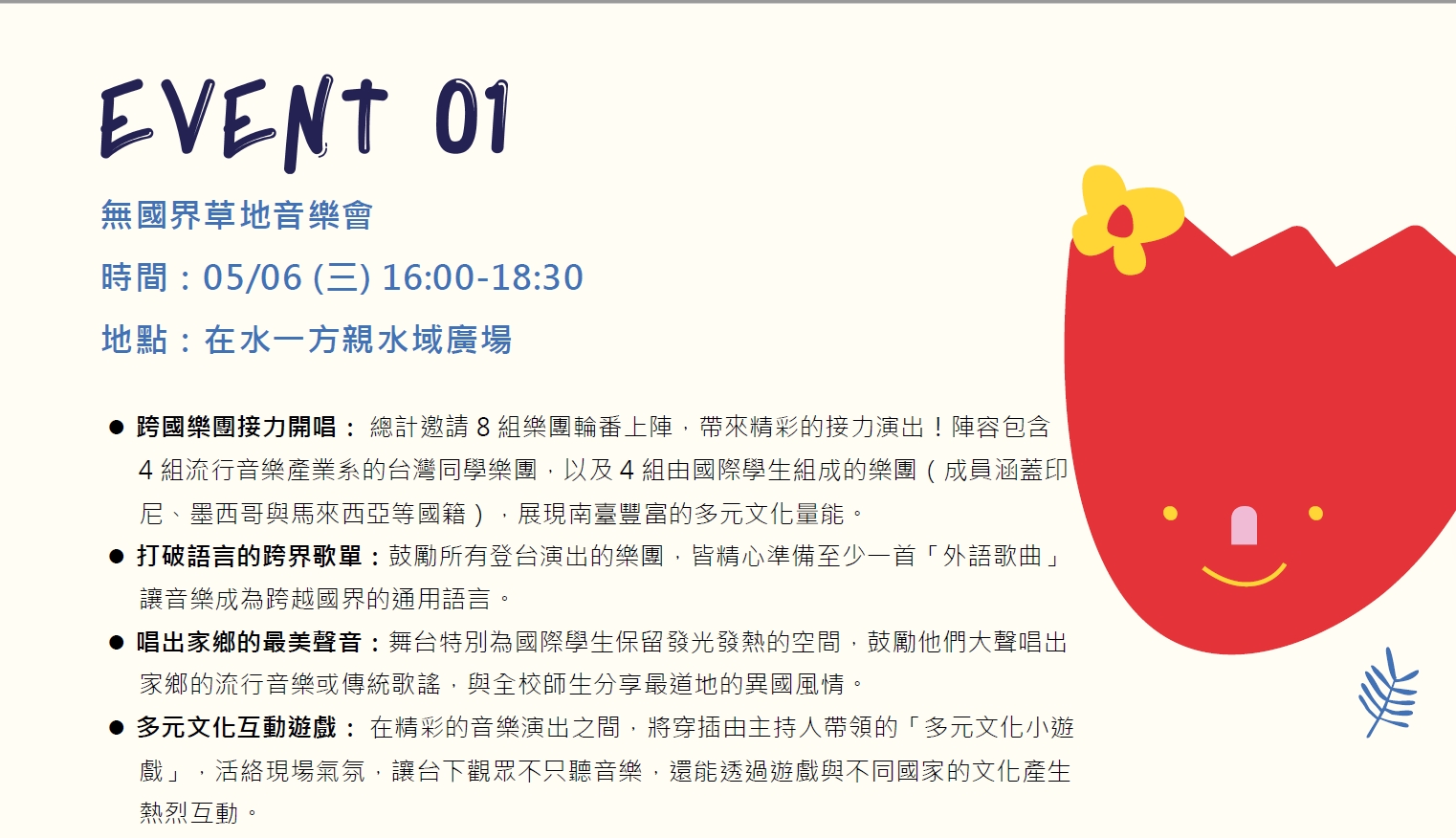 We cordially invite all students and faculty to join us for the "Music Without Borders × Waterfront Starry Cinema." From afternoon to night, immerse yourself in a cross-cultural feast of music, culture, and film! ✨