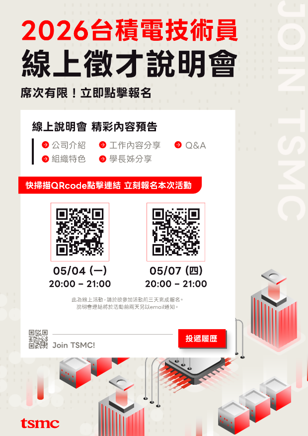 TSMC is actively recruiting Technicians and will host online information sessions on: 📅 May 4 (Mon) & May 7 (Thu) ⏰ 20:00 – 21:00 The sessions will include: Company introduction Organizational culture and features Job responsibilities overview Experience sharing from current employees Live Q&A Through this event, we hope to help interested candidates gain a deeper understanding of the Technician role and working environment at TSMC. 🎓 Who can join? Fresh graduates and alumni within 3 years of graduation are warmly welcome! 📌 If you are interested, please scan the QR code in the attachment to register. (Both sessions are equally informative—feel free to join either one!) 📧 A confirmation email with the event link will be sent 2 days before the session upon successful registration. We sincerely invite you to join us online!