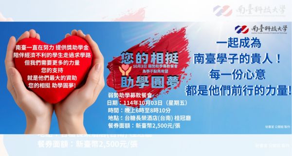 為減輕本校經濟不利學生的就學負擔,南臺科技大學將於114年10月03日(星期五)晚間6時至8時10分,於台糖長榮酒店(台南)桂冠廳舉辦「弱勢助學募款餐會」。本次活動誠摯邀請社會各界、校友與善心人士共襄..