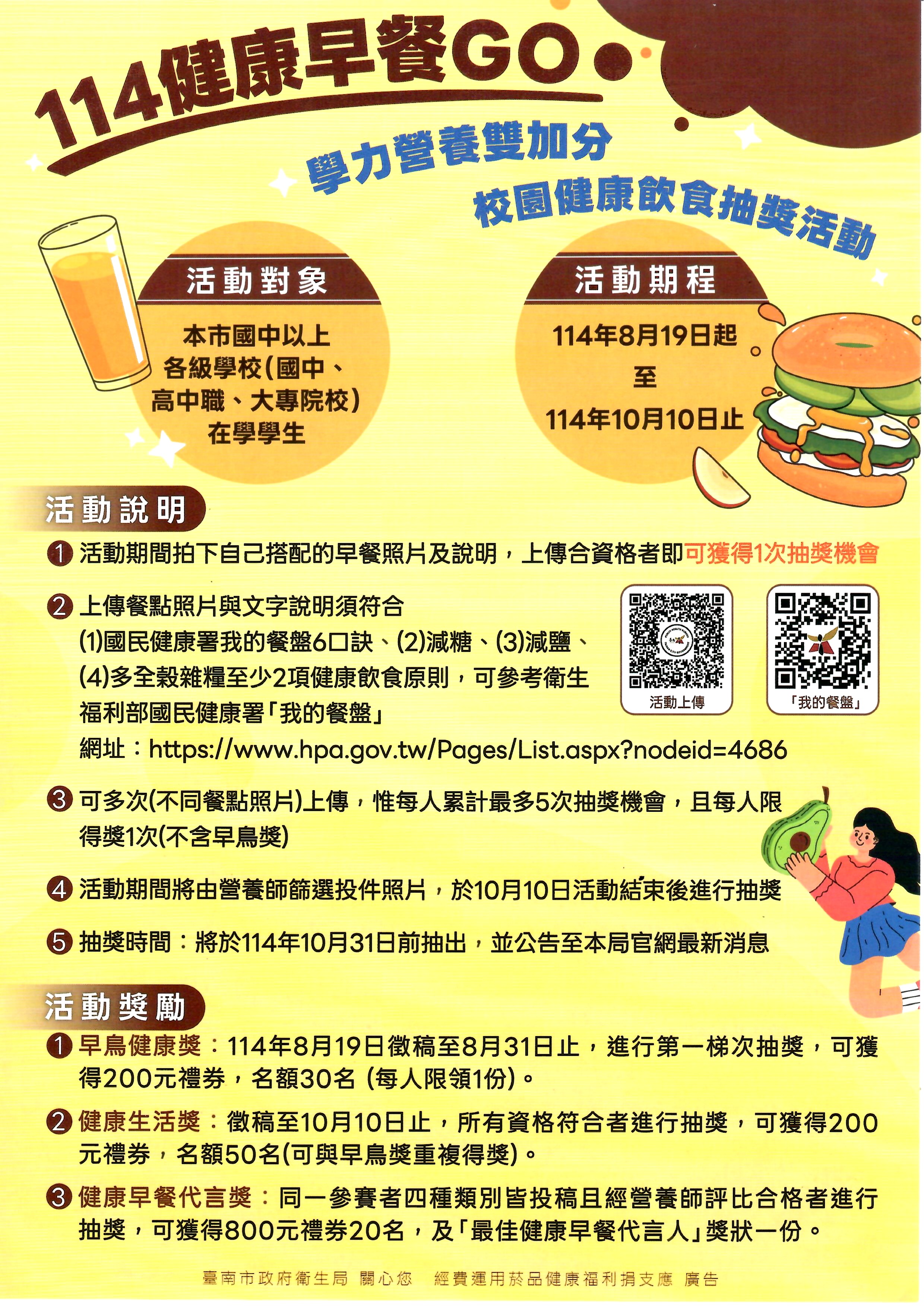 臺南市114年「早餐GO-學力營養雙加分校園健康飲食獎勵計畫」活動開跑囉~~