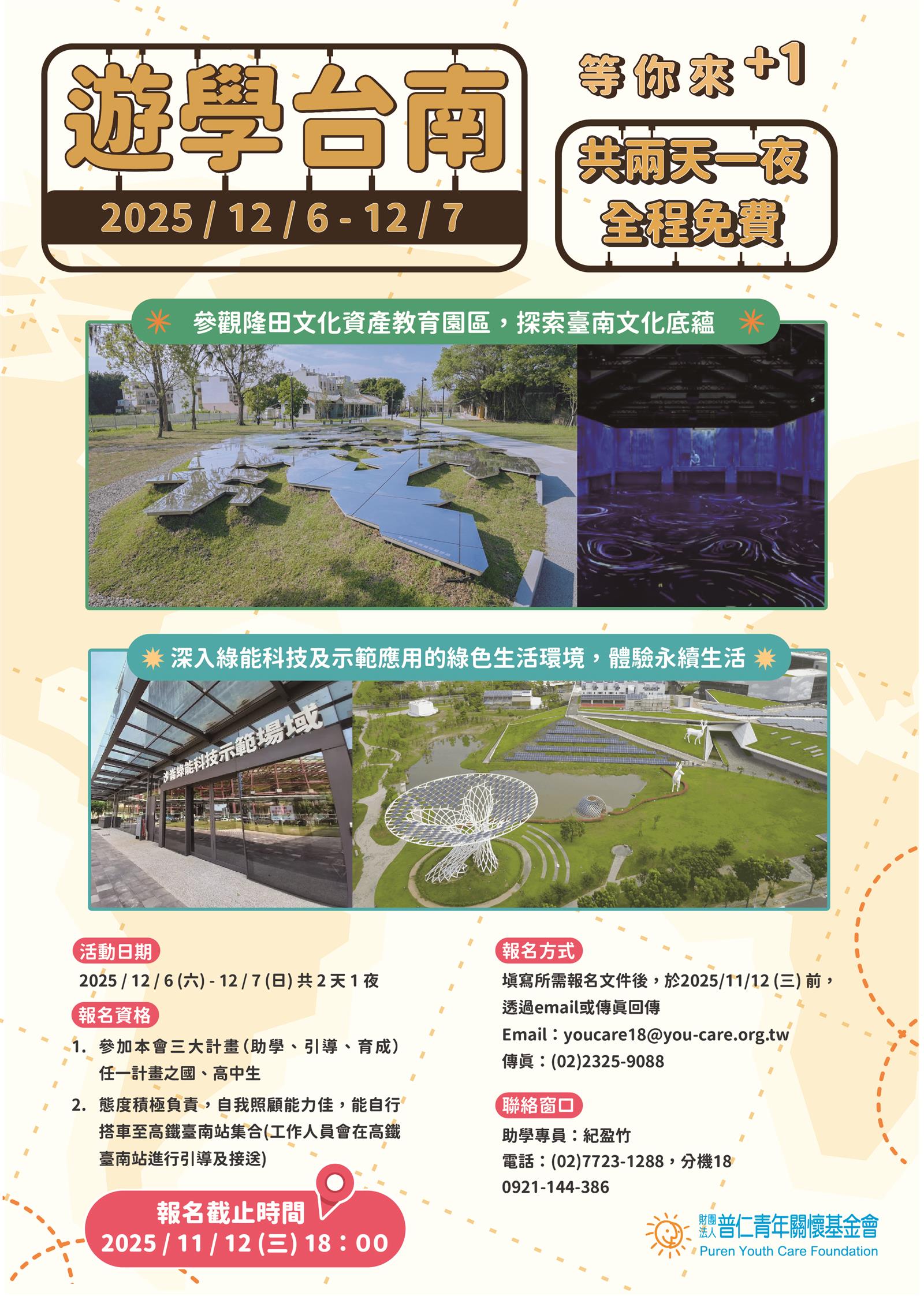 一、2025年12月6日(六)至12月7日(日),舉辦2025年遊學臺南青少年體驗活動,費用全免,凡參與本會助學計畫、引導計畫或育成計畫之國、高中生皆可報名。 二、報名期間自即日起至2025年11月12日(三)止。 三、若報名人數過多時,將進行甄選,以從未參加過的學生優先錄取。 四、檢附報名簡章/報名表、活動海報一份。