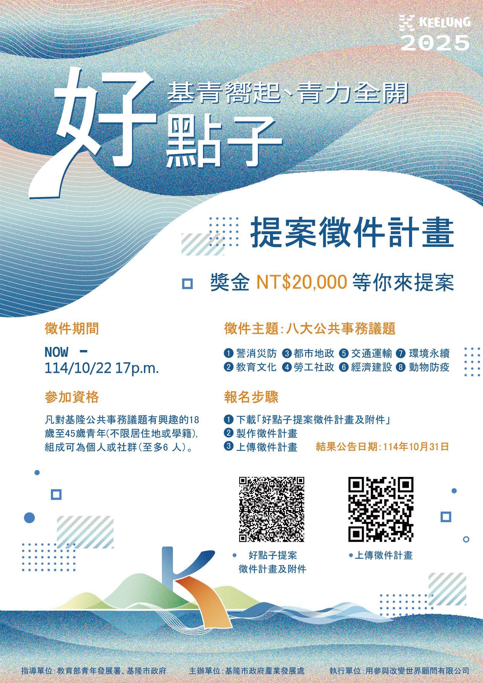 一、為響應「國家希望工程」中「青年賦權」的願景,並配合教育部青年發展署的施政目標,該府將建構公開、透明且具備實驗精神的治理平臺,以促進公民社會議題的由下而上討論與倡議,並藉由青年團體所具備的創新思維與行動熱情,結合社會責任與專業領域,深入探討基隆市八大領域的公共議題,提出具備在地連結與創新思維的提案。