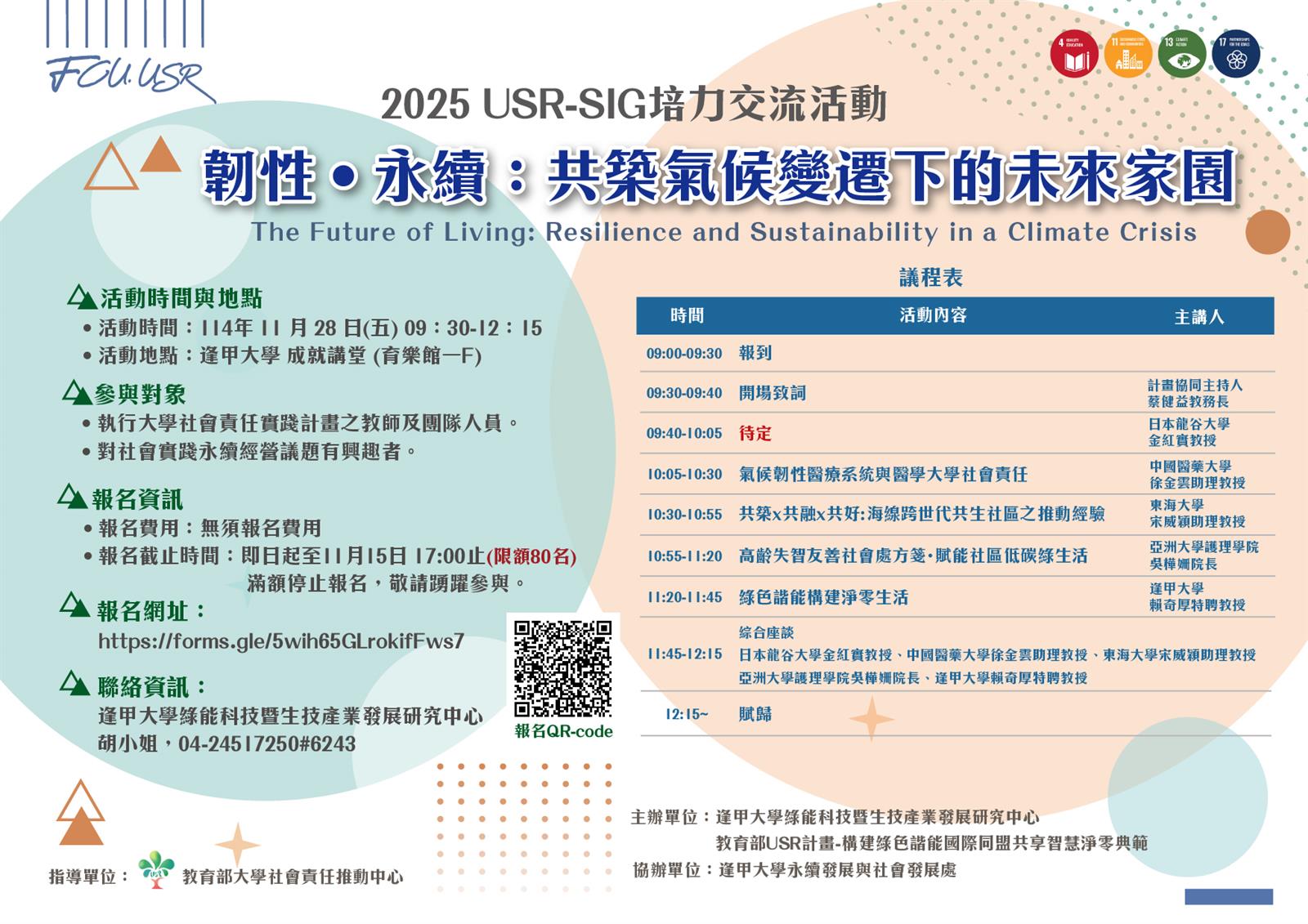 三、活動謹訂於114年11月28日(星期五)上午9時30分,地點於逢甲大學成就講堂(育樂館1F),並請於114年11月15日前完成線上報名(報名網址:https://forms.gle/5wih65GLrokifFws7)。