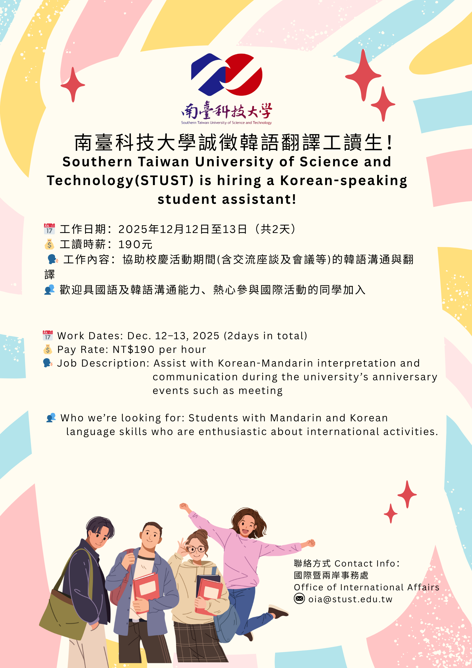 Southern Taiwan University of Science and Technology (STUST) is seeking Korean-speaking student assistants to support translation and reception tasks during the university’s anniversary celebration.