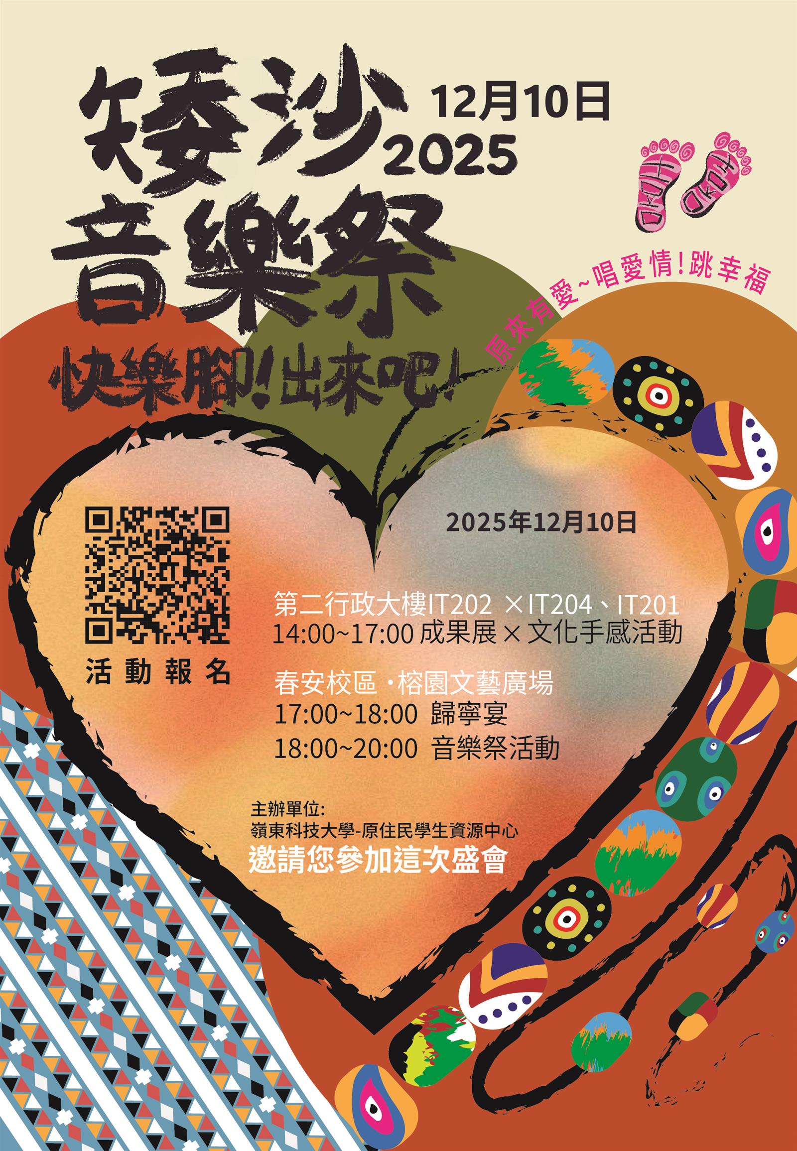 一、活動目的:本校推動全民原教,分享原住民文化之美,藉由系列音樂祭文化活動,營造友善校園環境。 二、活動日期:114年12月10日(星期三),音樂祭文化系列活動之詳細時間與地點,如附件。 三、活動內容:原民音樂分享、原民手作體驗、影像展覽等。 四、報名方式:採線上報名。 五、敬請貴校協助公告,並鼓勵師生踴躍報名參加。 六、聯絡方式: (一)聯絡人:原住民族學生資源中心 邱瑞琳。 (二)聯絡電話:(04)2389-2088分機1432