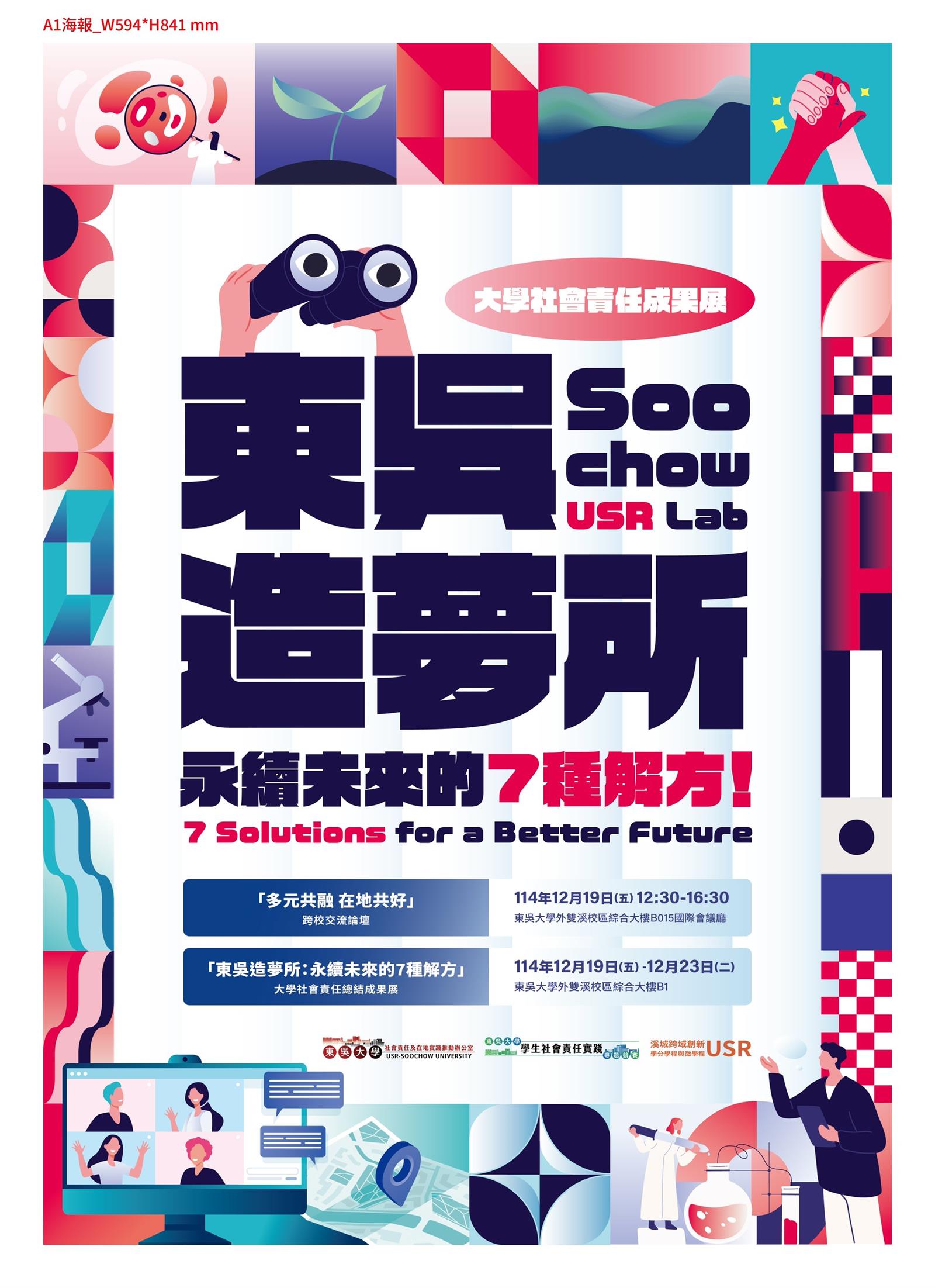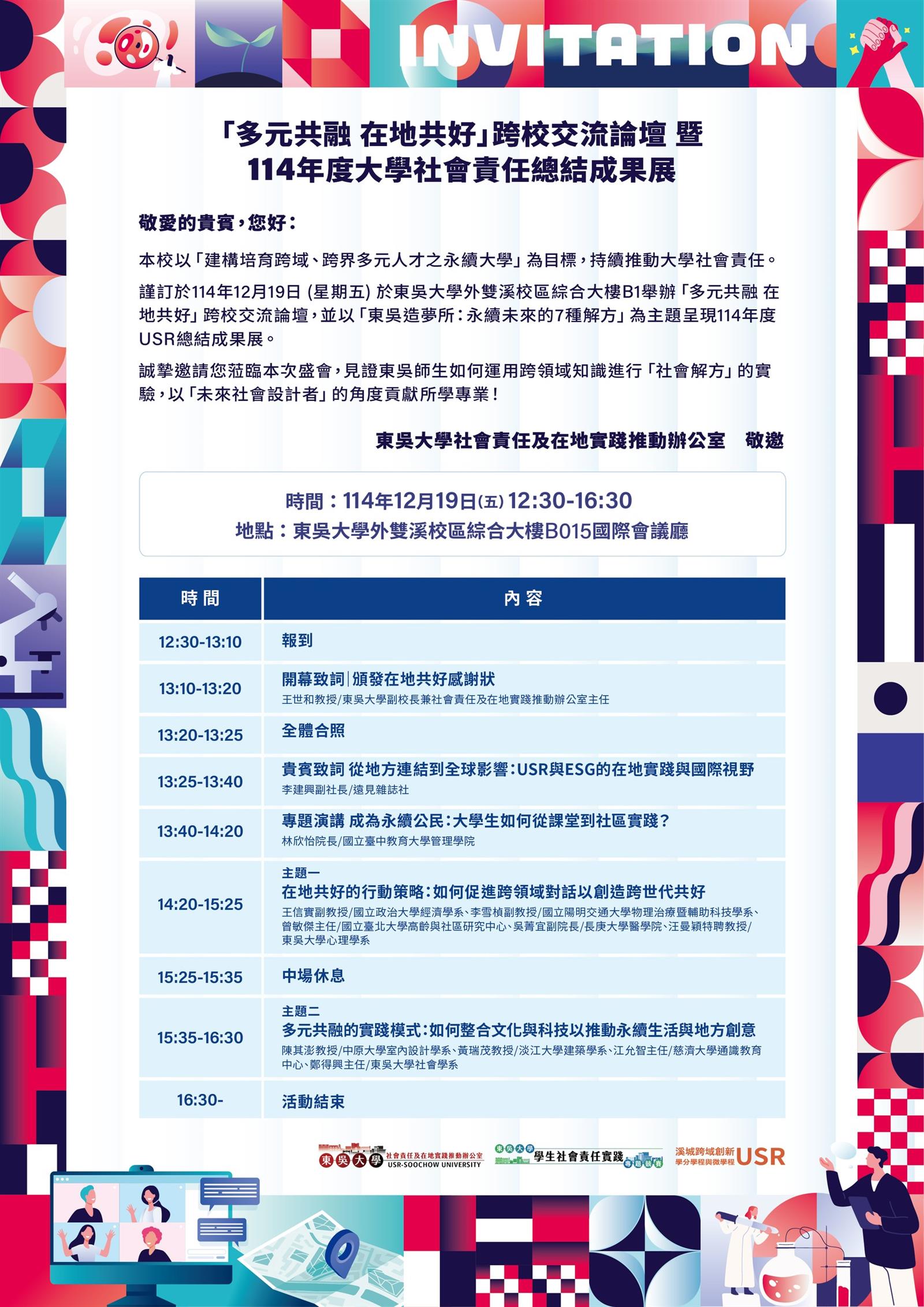 一、活動訊息如下: (一)論壇時間/地點:114年12月19日(五)下午13:10~16:30/東吳大學外雙溪校區綜合大樓B015國際會議廳(台北市士林區臨溪路70號)。 (二)成果展時間/地點:114年12月19日(五)至114年12月23日(二)/東吳大學外雙溪校區綜合大樓B1。 (三)報名網址:https://forms.gle/nzX4tCRAtU6aKEjZA。 (四)聯繫資訊:陳冠霖行政助理,電話(02)2881-9471分機5225。 活動詳情請見附檔海報及議程