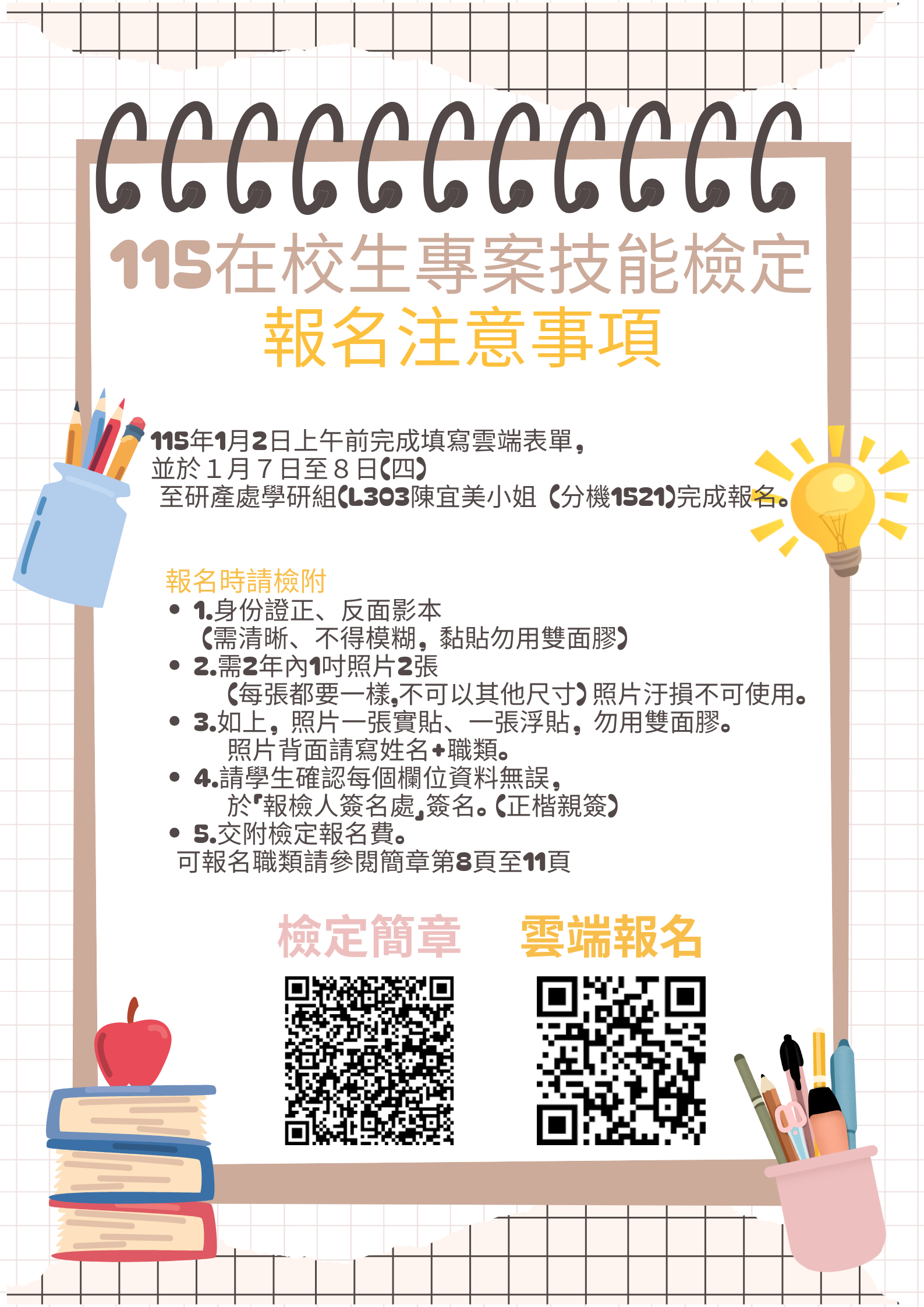 請於115年1月2日上午前完成填寫雲端表單(https://forms.office.com/r/4HT8eQmj40)或掃下方海報QRcode,並於1月7日至8日(四)至本校研產處學研組(L303陳宜美小姐(分機1521)完成報名。