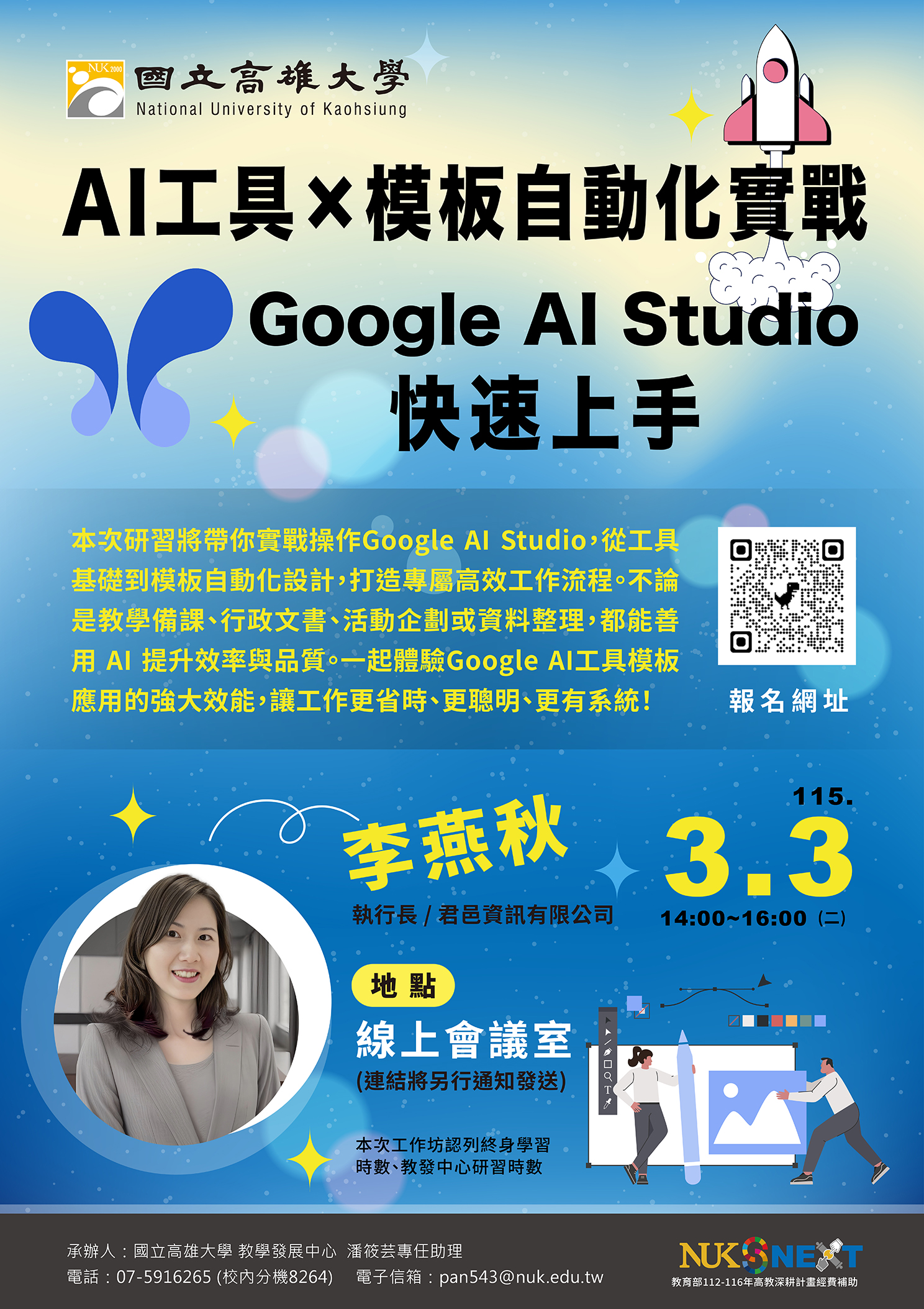 一、旨揭活動將實戰操作Google AI Studio,從AI工具基礎到模板自動化設計,不論是教學備課、行政文書、活動企劃或資料整理,打造個人專屬高效工作流程。