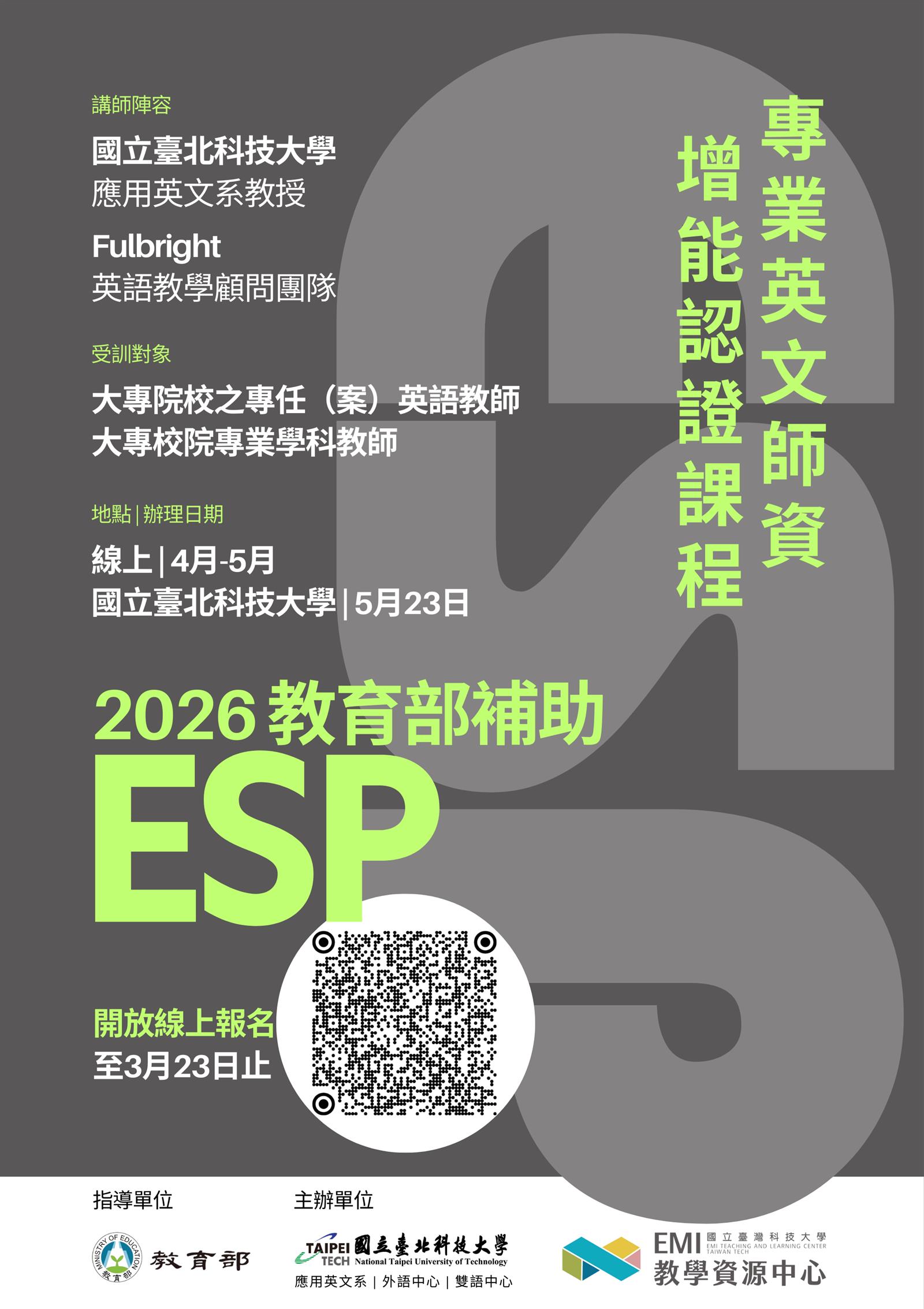 二、國立臺灣科技大學EMI教學資源中心特與國立臺北科技大學合作辦理「ESP專業英文師資增能認證」課程,導入國際學術資源及專業英文課程建構經驗實踐分享,銜接各校特色之全英語授課(EMI)教學方針,從ESP與EMI面向雙軌並進,全面推動雙語教學。相關報名資訊如下: