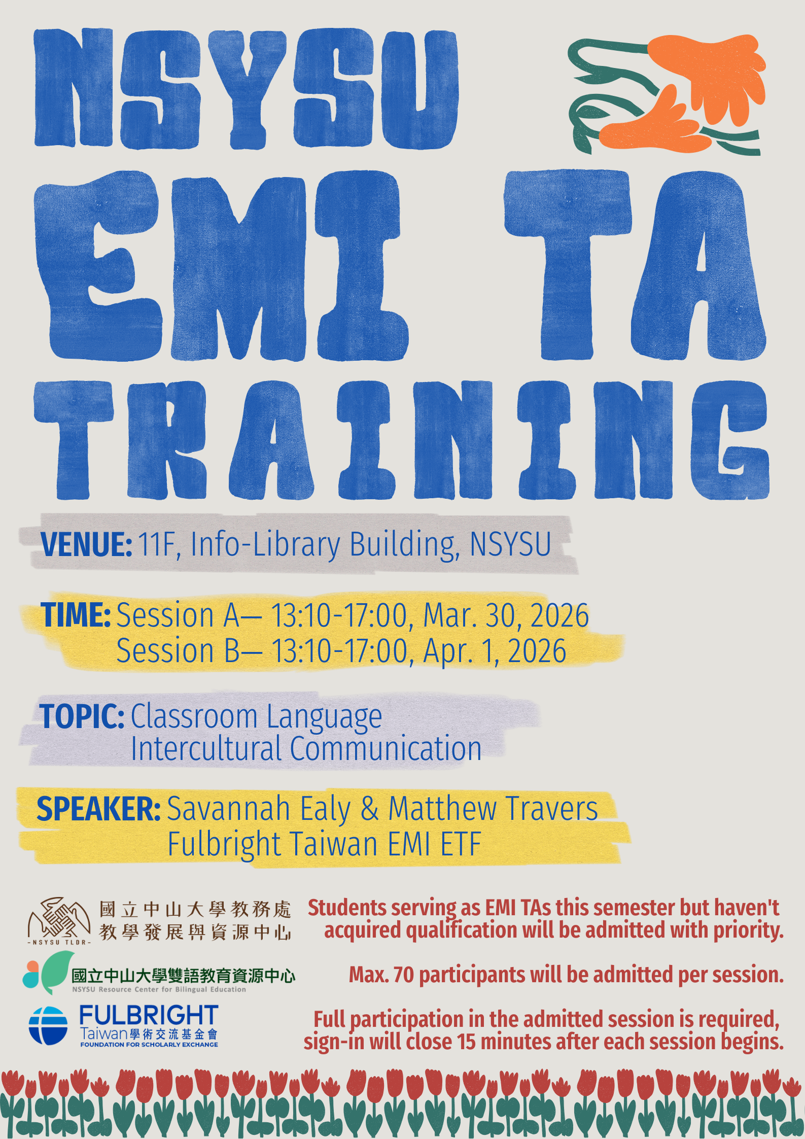 I. To enhance student learning outcomes and teaching assistant skills in EMI courses, the Bilingual Education Resource Center of National Sun Yat-sen University is offering EMI teaching assistant training. Faculty members from the Foundation for Scholarly Exchange (FSE) will teach two courses: "Classroom Language (including pronunciation)" and "Intercultural Communication."