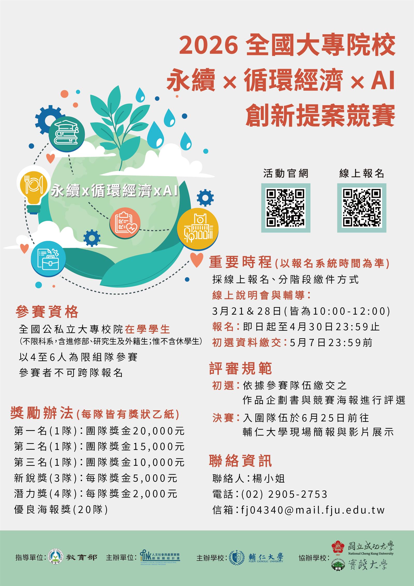 輔仁大學於115年6月25日舉辦「2026 全國大專院校永續 × 循環經濟 × AI 創新提案競賽」,歡迎各位學生踴躍報名參加。