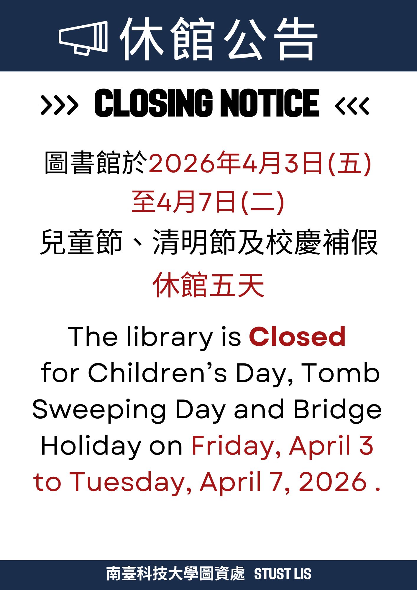 圖書館於2026年4月3日(五)至4月7日(二)兒童節、清明節及校慶補假 休館五天。 The library is Closed for Children’s Day, Tomb Sweeping Day and Bridge Holiday on Friday, April 3 to Tuesday, April 7, 2026 .