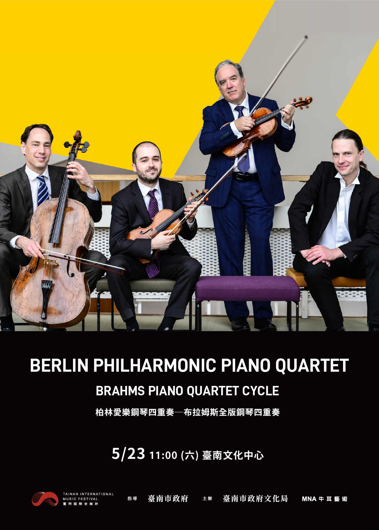 一、臺南市政府文化局辦理「2026臺南國際音樂節-柏林愛樂鋼琴四重奏節目」,演出時為114年5月23日上午11時30分,曲目為布拉姆斯全版鋼琴四重奏,故有兩次中場休息包含中午用餐,音樂會結束時間約下午3時。