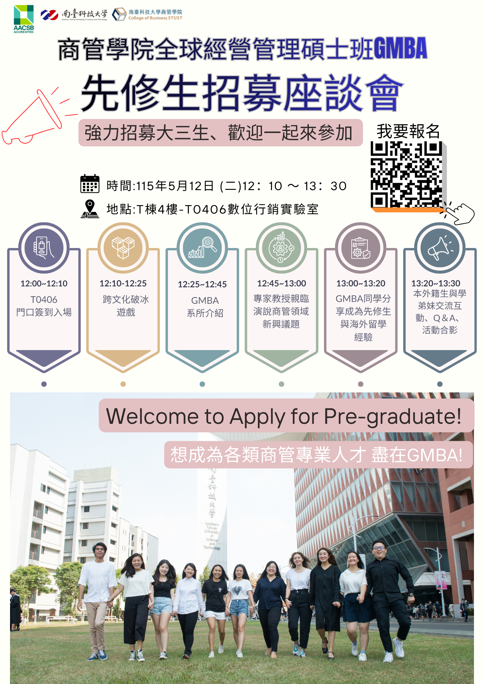 GMBA所長與教授為幫助大學部同學更加了解本碩士班的課程設計理念和特色,特於校內舉辦「先修生招募與職涯講座說明會」,內容如下: