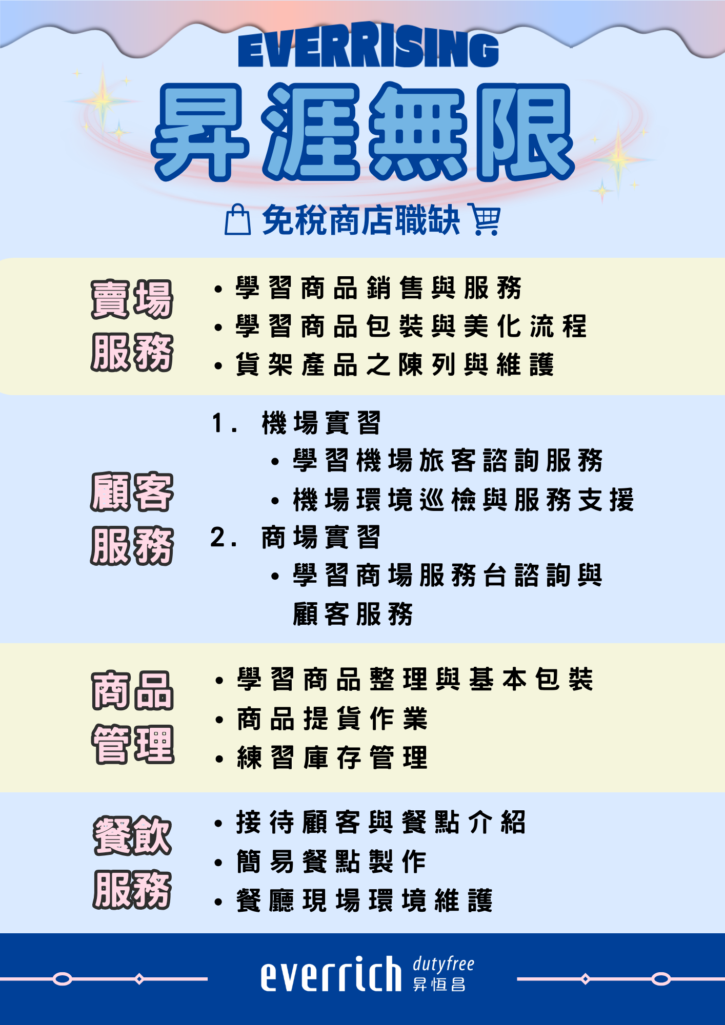 昇恆昌免稅商店實習職缺持續熱烈招募中!🔥 📌另外,我們將舉辦線上實習說明會💻 報名連結👉https://forms.gle/oe9p2XMqKhW7xd4VA👈 說明會已同步整合實習報名表,讓同學了解實習資訊的同時就能直接報名線上說明會! 📅 說明會時間 🔸 4/23(四)12:30~13:00 🔸 4/24(五)12:30~13:00 延續往年小驚喜🎁✨ 凡完成報名並全程參與說明會的同學就可已獲得獨家精美小禮物🎉 詳細資訊請參閱附件