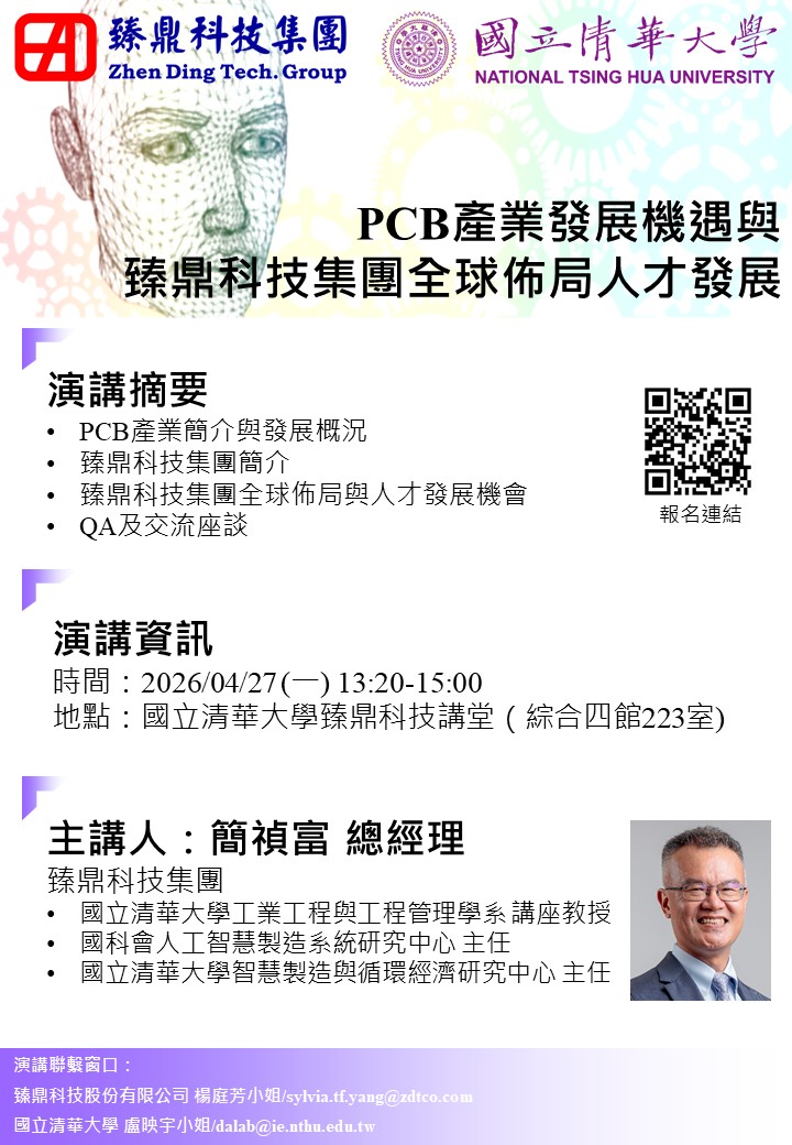 誠摯邀請您參加由臻鼎科技集團(Zhen Ding Tech. Group)與國立清華大學聯合舉辦的專題講座。