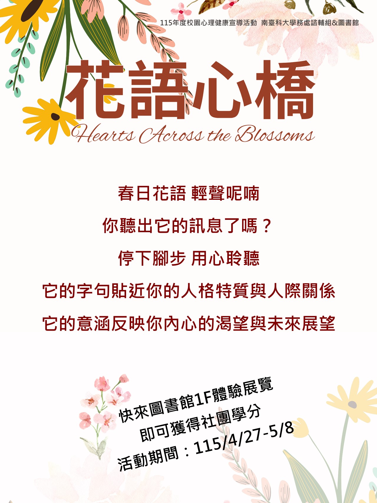 春日花語 輕聲呢喃 你聽出它的訊息了嗎? 停下腳步 用心聆聽 它的字句貼近你的人格特質與人際關係 它的意涵反映你內心的渴望與未來展望 活動期間:115/04/27-05/08 來圖書館1樓體驗展覽,即可獲得社團學分