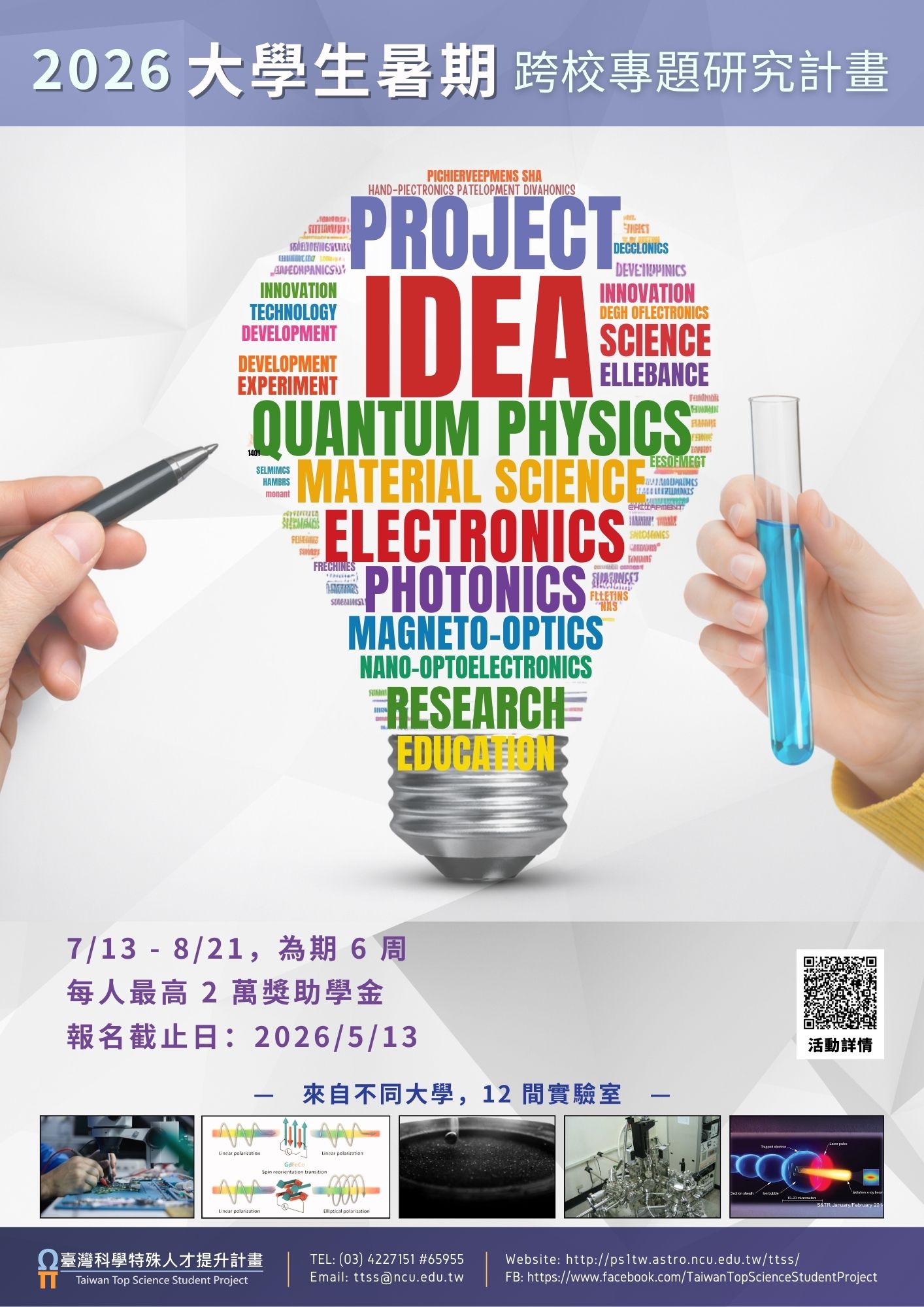 國立中央大學訂於115年7月13日至8月21日辦理「大學生暑期跨校專題研究計畫」,鼓勵學生踴躍報名參加