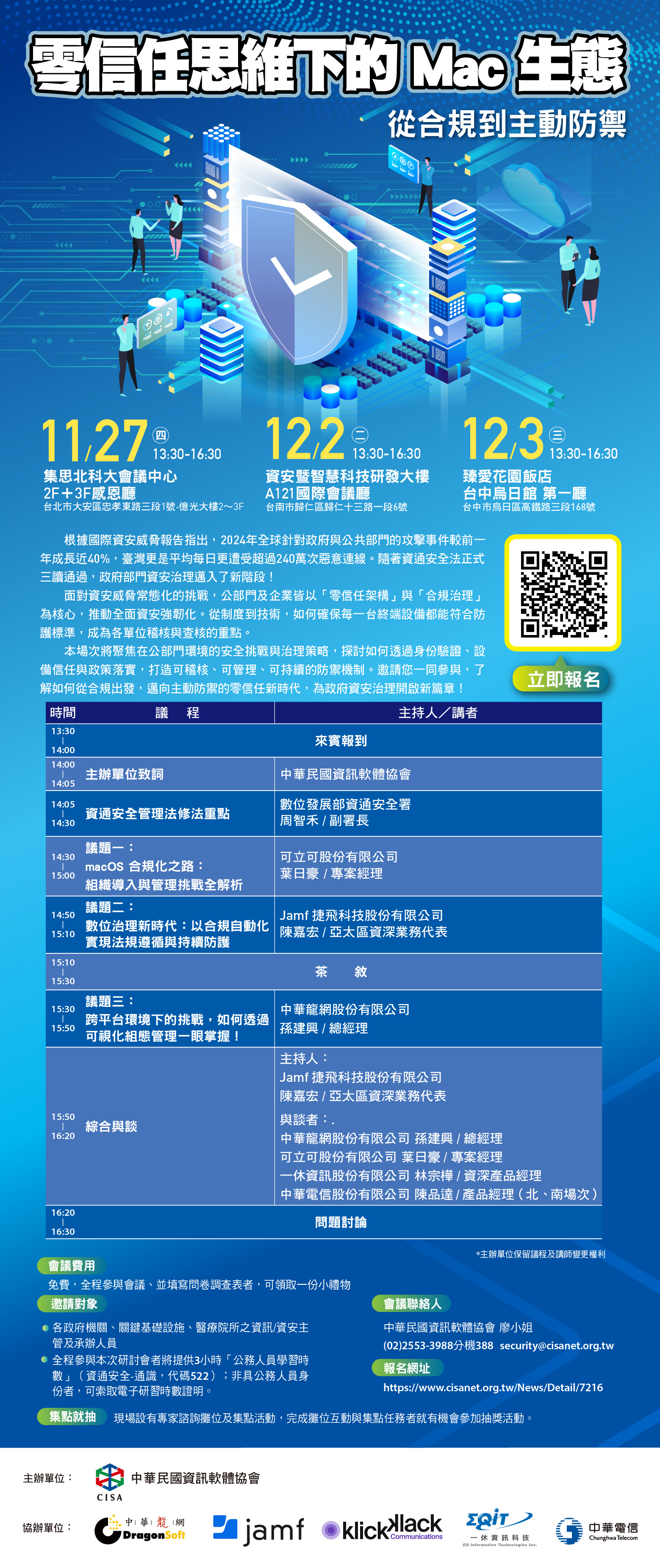 The Information Service Industry Association of R.O.C. (CISA) is organizing a seminar titled “Mac Ecosystem under Zero Trust Thinking: From Compliance to Proactive Defense.” Colleagues interested in this topic are warmly invited to participate.