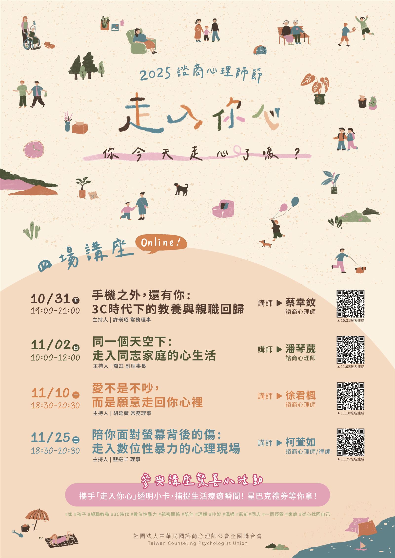 This year's Counseling Psychologists' Day is themed "Entering Your Heart," focusing on the psychological needs of different life stages and diverse groups. Mental health is not just about seeking help in difficult times, but also exists in daily life. Through this event, we hope to guide society to see that psychological needs are real and diverse, deserving of understanding and care; and to remind everyone to pause at appropriate times in their life journey to listen to their inner voice and take care of themselves.