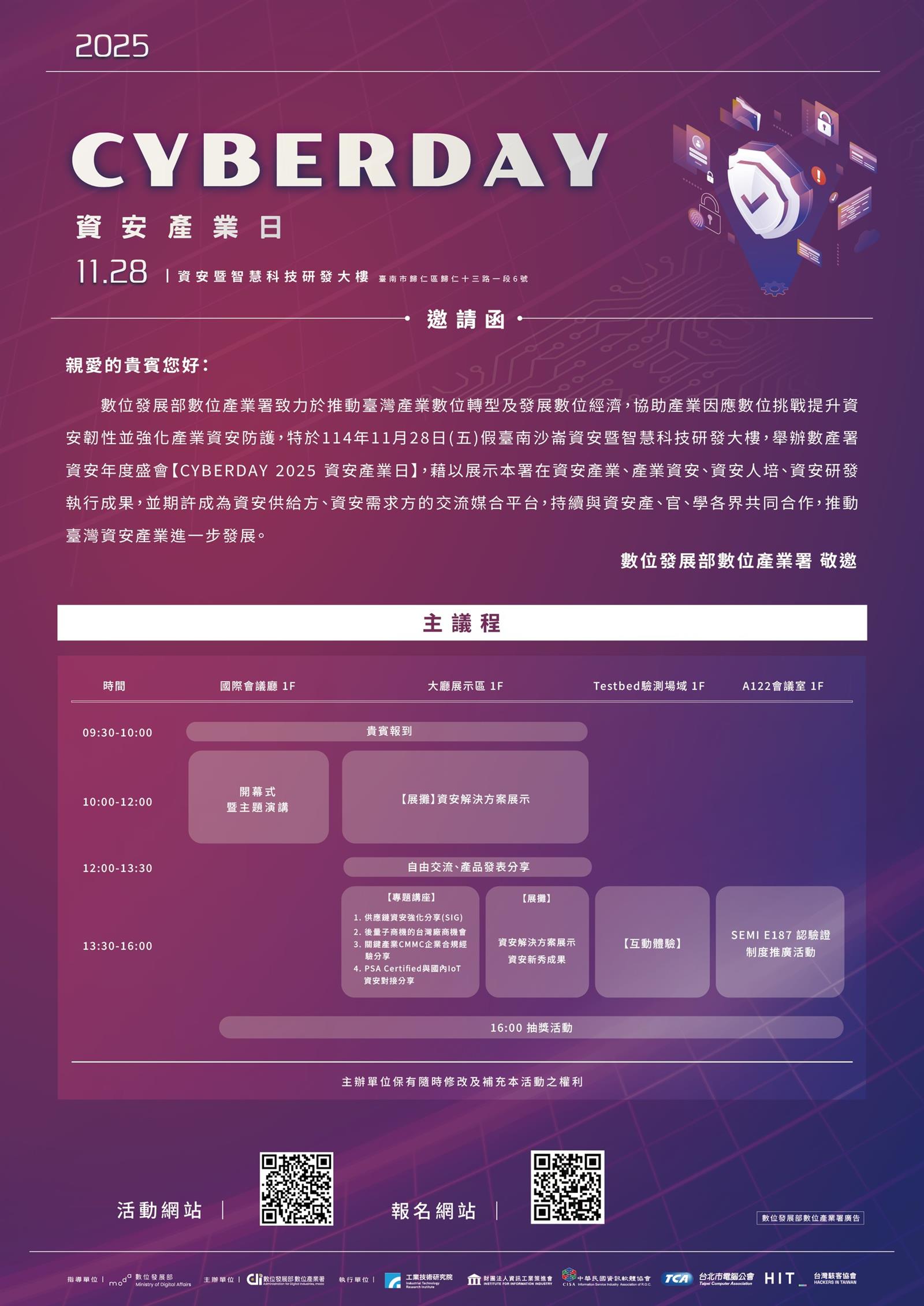 III. Registration for "CyberDay 2025 Cybersecurity Industry Day" is welcome. Registration website: https://www.cyberday.com.tw/ Registration period: From now until November 27th (Thursday).