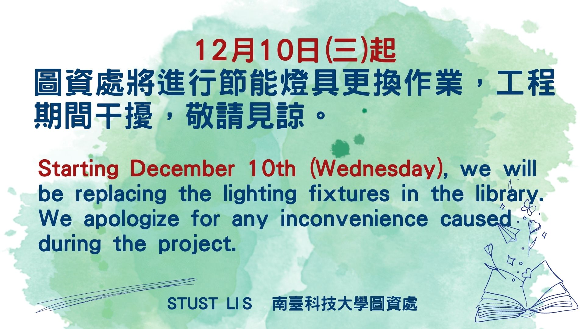Starting December 10th (Wednesday), we will be replacing the lighting fixtures in the library. We apologize for any inconvenience caused during the project.