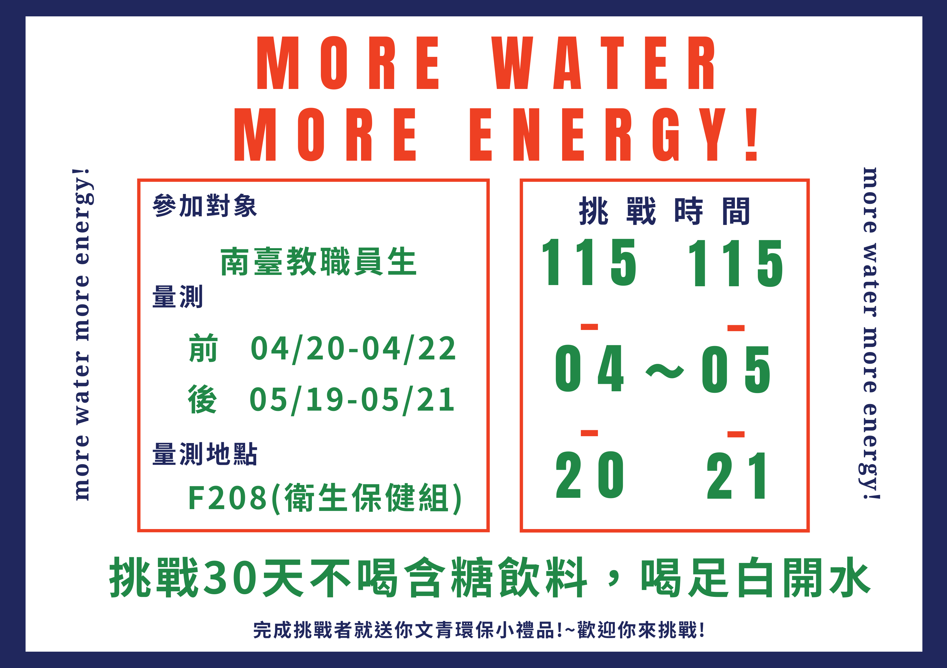 (3) Challenge card collection and eco-friendly gift redemption time: May 19-21, location: F208. (4) If the achievement rate (including not drinking sugary drinks and drinking enough plain water) exceeds 90%, you can redeem an eco-friendly gift with your card.