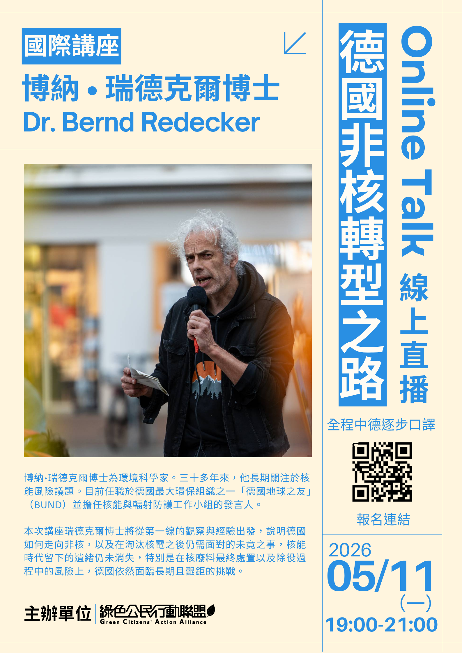[Lecture] The Taiwan Green Citizens Action Alliance Association will hold an online lecture on "Germany's Path to Nuclear-Free Transition" on May 11, 2026 (Monday). All are welcome to register and participate.